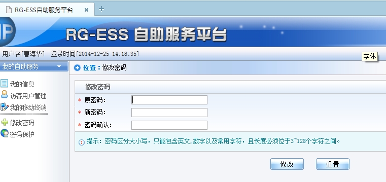 校园无线网密码修改方法 来源: 发布时间:2015-01-28 17:09:02 浏览次数: 次 【字体:小 大】 第一步:打开http://192.168.100.246:28080/ess/selfservice,输入用户名、密码、验证码 ,完成登录。 第二步:单击左侧“修改密码”菜单,在右侧按要求设置新密码。 分享到: 【打印正文】